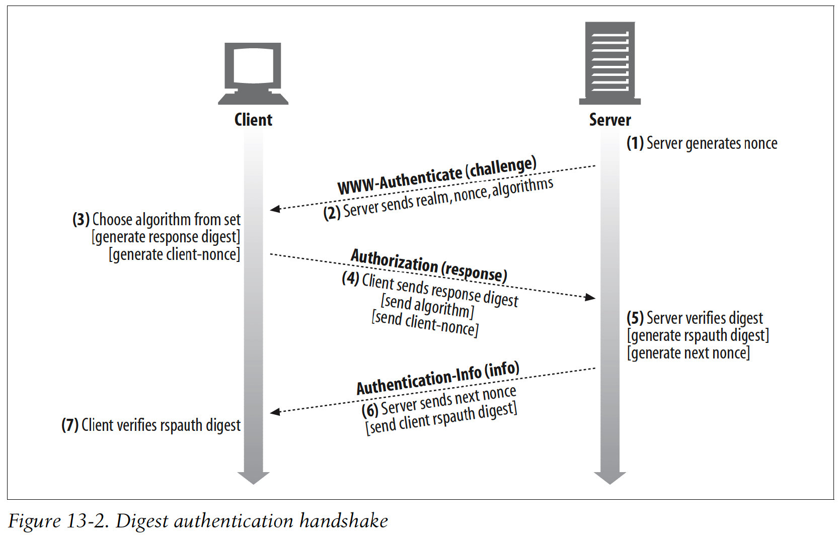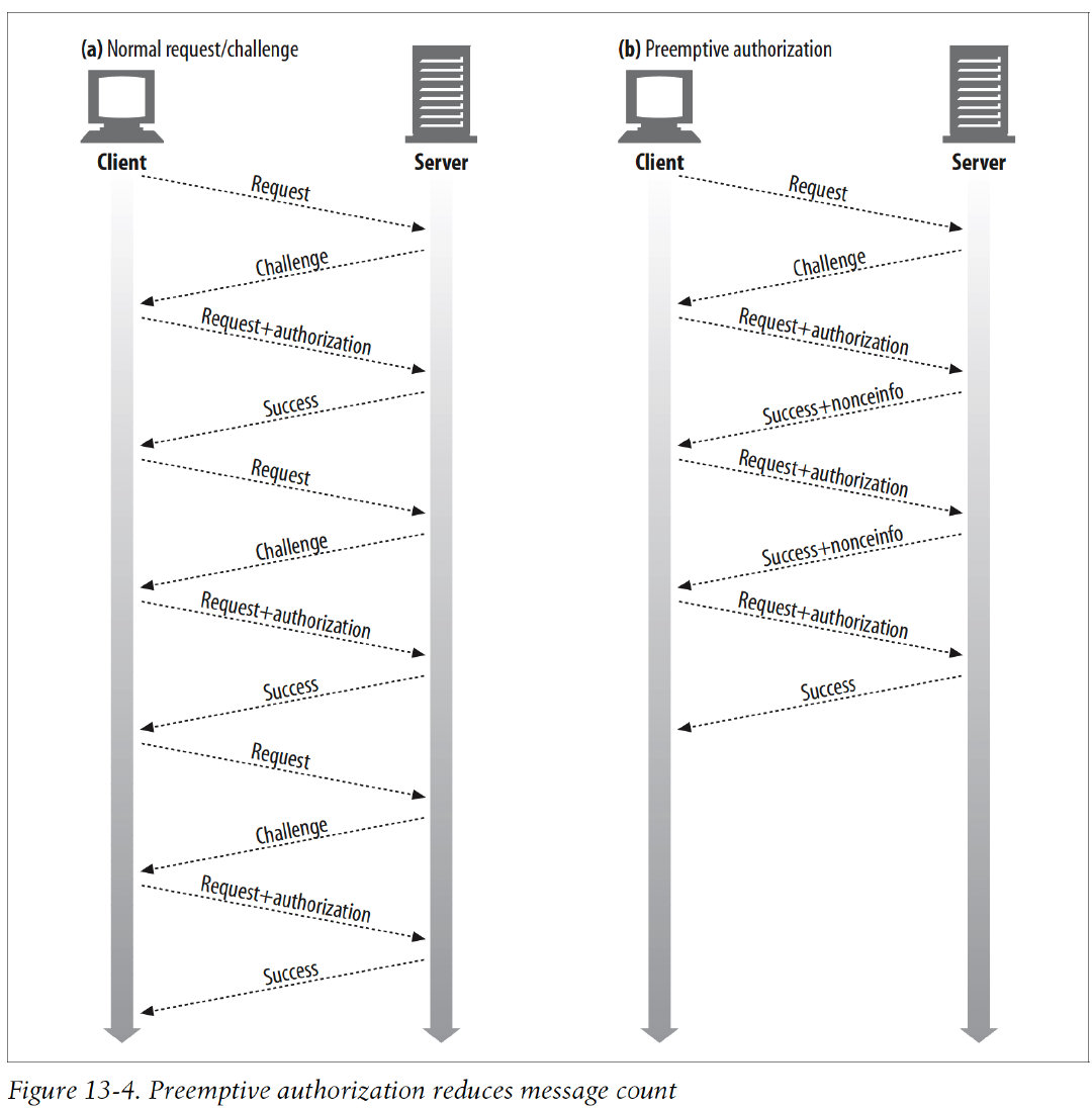 This request/challenge cycle can be eliminated if the client knows in advance what the next nonce will be, so it can generate the correct Authorization header before the server asks for it. This is depicted in Figure 13-4b.