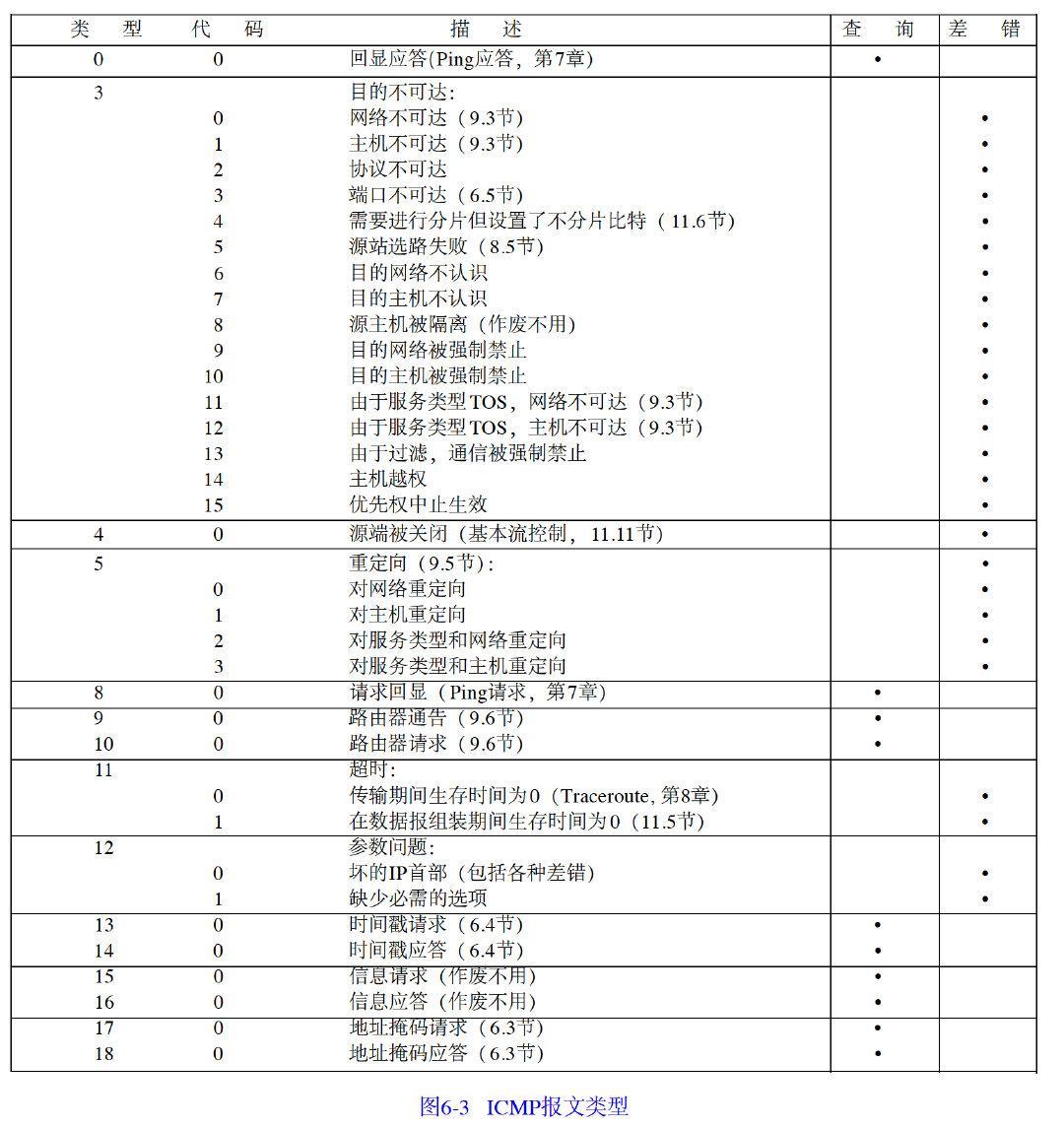 类型(type)可以有15个不同的值,用来描述不同类型的ICMP报文,还可以使用代码(code)来进一步指定不同的类型。