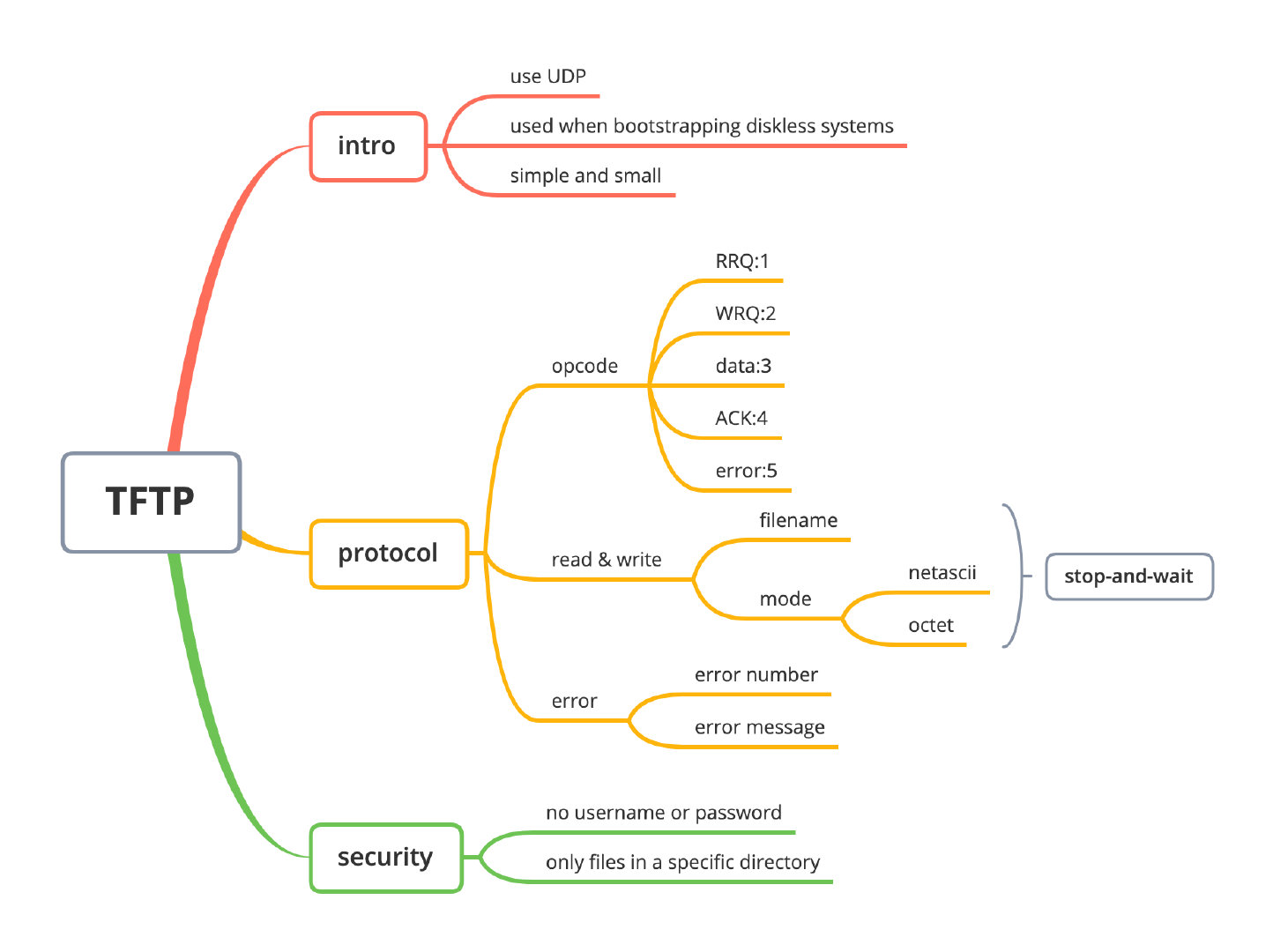 RRQ和WRQ提供文件名,比如client发送一个RRQ,server使用ACK进行确认,然后两方使用stop-and-wait的方式传输数据。