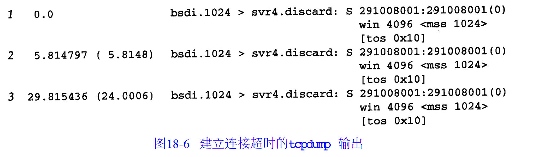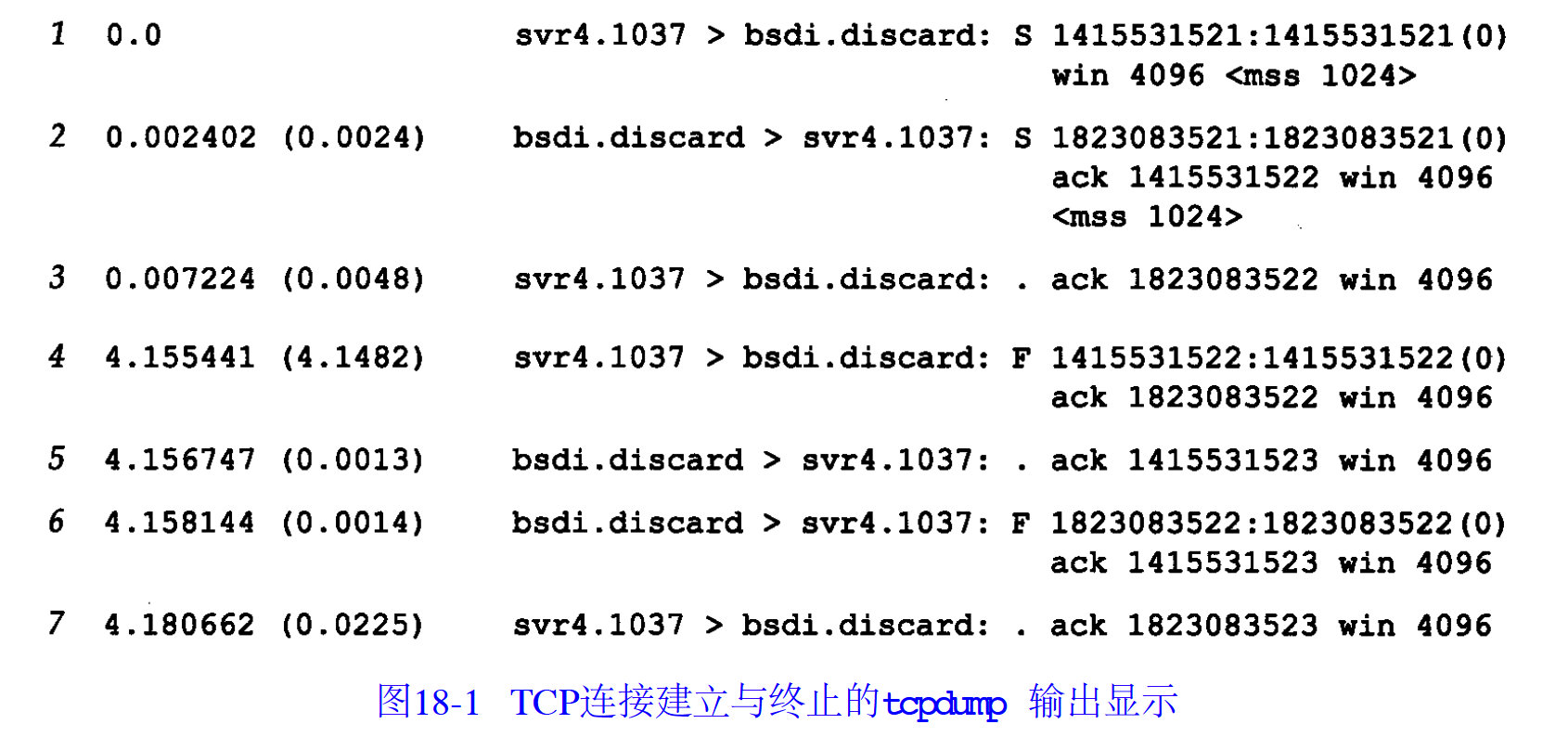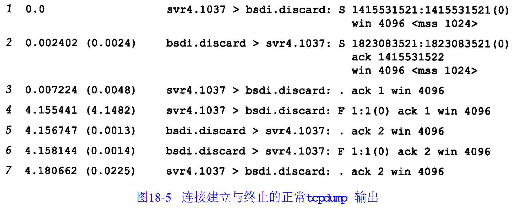 所以第一行的例子是说,svr4的1037上发起一个请求,目的是bsdi的discard进程,flag是S,代表了SYN。